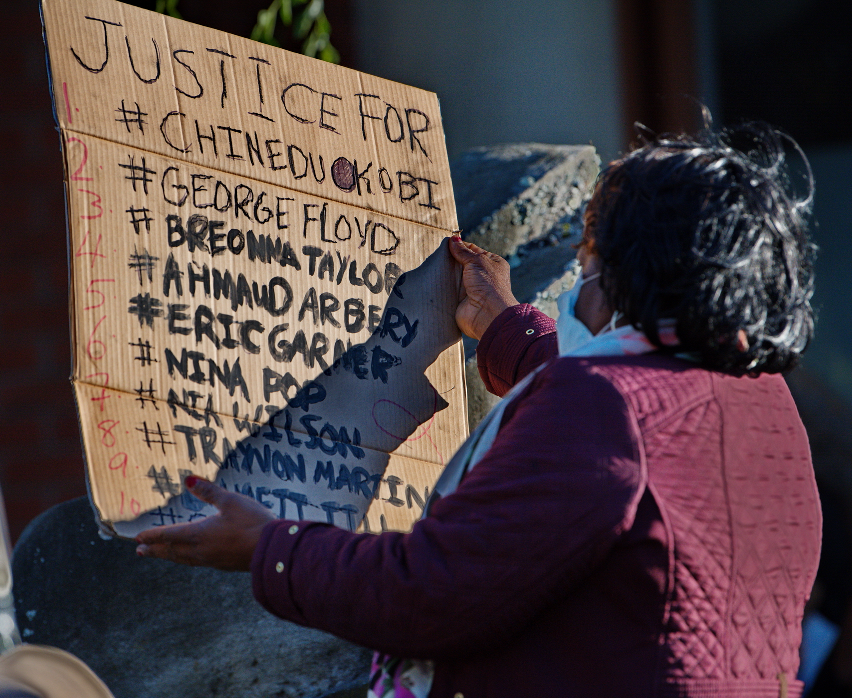 It was sunny and windy as about 300 demonstrators gathered on a hill at the high school to hear speakers. They then marched to the El Camino Real and the site of Okobi's murder, with signs demanding justice and the defunding of the police. They paused for a moment of silence. By the time they reached the Millbrae police station their number increased to about 500.