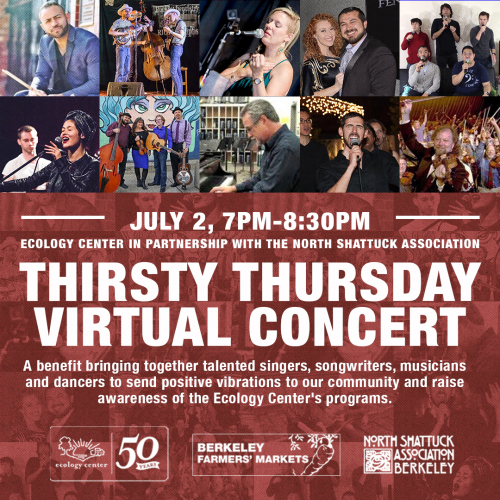 You’re invited to join the Ecology Center for a virtual concert benefit on Facebook Live, highlighting many of the performers and musicians who would have joined with us in community at North Berkeley Farmers’ Market Thirsty Thursdays, Earth Day 2020, and at the Downtown Berkeley Farmers’ Market Salsa Festival.