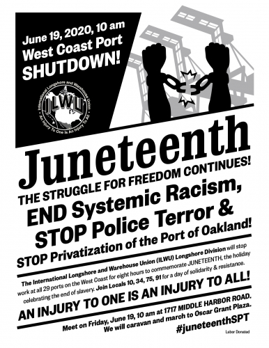 On Juneteenth all West Coast ports will be shut down by the ILWU to protest police terror and against systemic racism. In Oakland the march will start at SSA Terminals 1717 Middle Harbor Road at the Port of Oakland.
