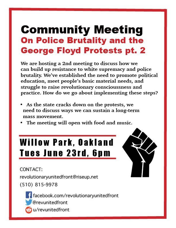 Please come out to Willow Park in Oakland on June 23rd at 6pm as we continue discuss how we can sustain this movement for the long-term. The last time we met, people discussed the need for more political education, meeting peoples basic material needs, and struggling to raise revolutionary consciousness and practice. We will discuss ways to work towards achieving these goals.