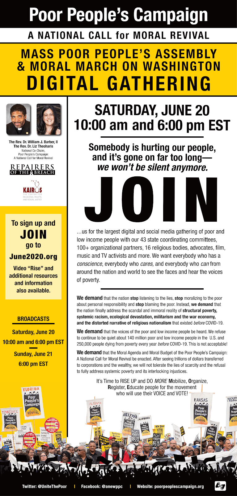 On June 20th, the Poor People's Campaign will hold the largest digital and social media gathering of poor and low-wealth people, moral and religious leaders, advocates, and