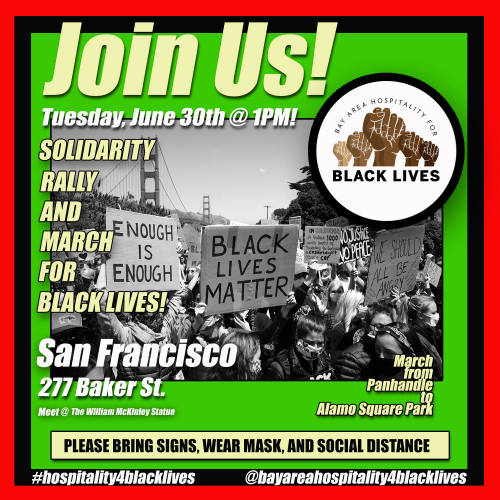 Please join us us in solidarity at 1pm on Tuesday, June 30th at the William McKinley statue (277 Baker St.) in the Panhandle for a socially distanced gathering. We will begin with a short opening program that highlights the changes we believe are necessary in our industry and will continue with a march through the Western Addition neighborhood in support of the Black Lives Matter movement.