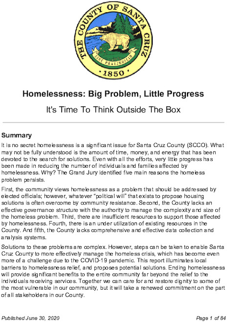 The overall purpose of the 2019-2020 Civil Grand Jury's report "Homelessness: Big Problem, Little Progress: It's Time To Think Outside The Box" was centered on, "understanding why, after spending tens of millions of dollars, the number of homeless remains high," according to the report. In addition, the Grand Jury, "sought to understand the extent of the homeless problem, and identify areas needing improvement," the report states.