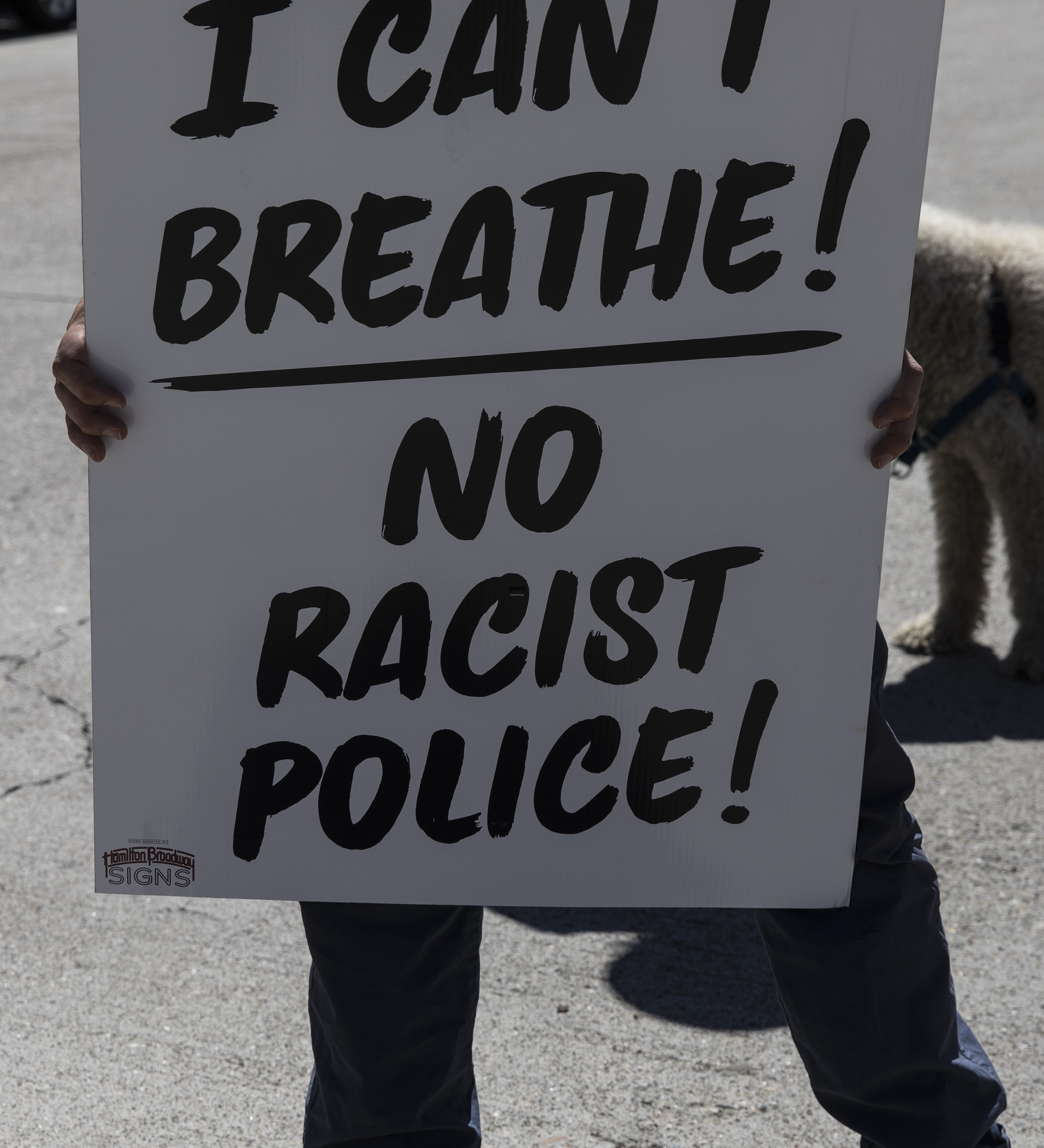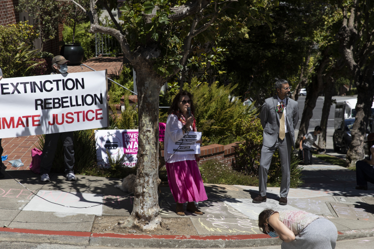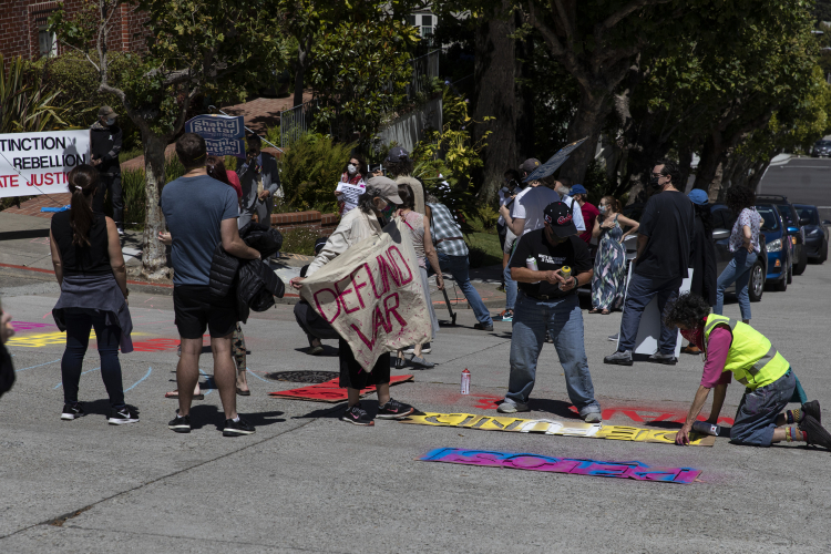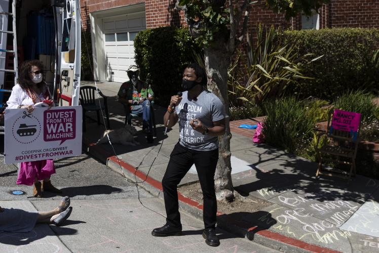 Their next stop was Nancy Pelosi's Pacific Heights house where protesters immediately began painting a message to the Congresswoman, "Pelosi Defund War $." They chalked other slogans on the sidewalk next to her house including one that read, "where we allocate funds speaks to our values." Placards included a boldly printed sign, "I Can't Breathe...No Racist Police." Pelosi is running for another term in Congress, and organizers invited her to debate her opponent, Shahid Butter, on the issue of defunding the Pentagon. Ms. Pelosi did not show up, so Mr. Buttar debated an empty chair with a neon pink sign, "Nancy Pelosi, Candidate for Congress."