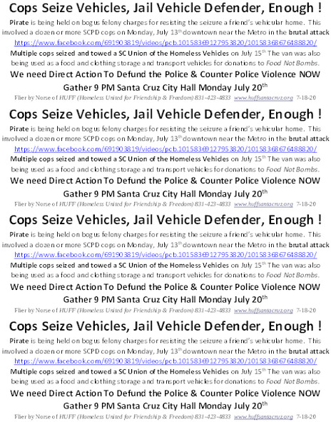 Marty M, also known as Pirate, brutally seized by police, jailed, and charged with felonies for defending a friend's vehiclehome, has reportedly been released after friends paid the ransom ($2500 for a $25,000 bail). To discourage future such anti-homeless abuses and restore real security in our community, come to the Direct Action protest tonight 7-20 Monday at 9 PM at the Town Clock.