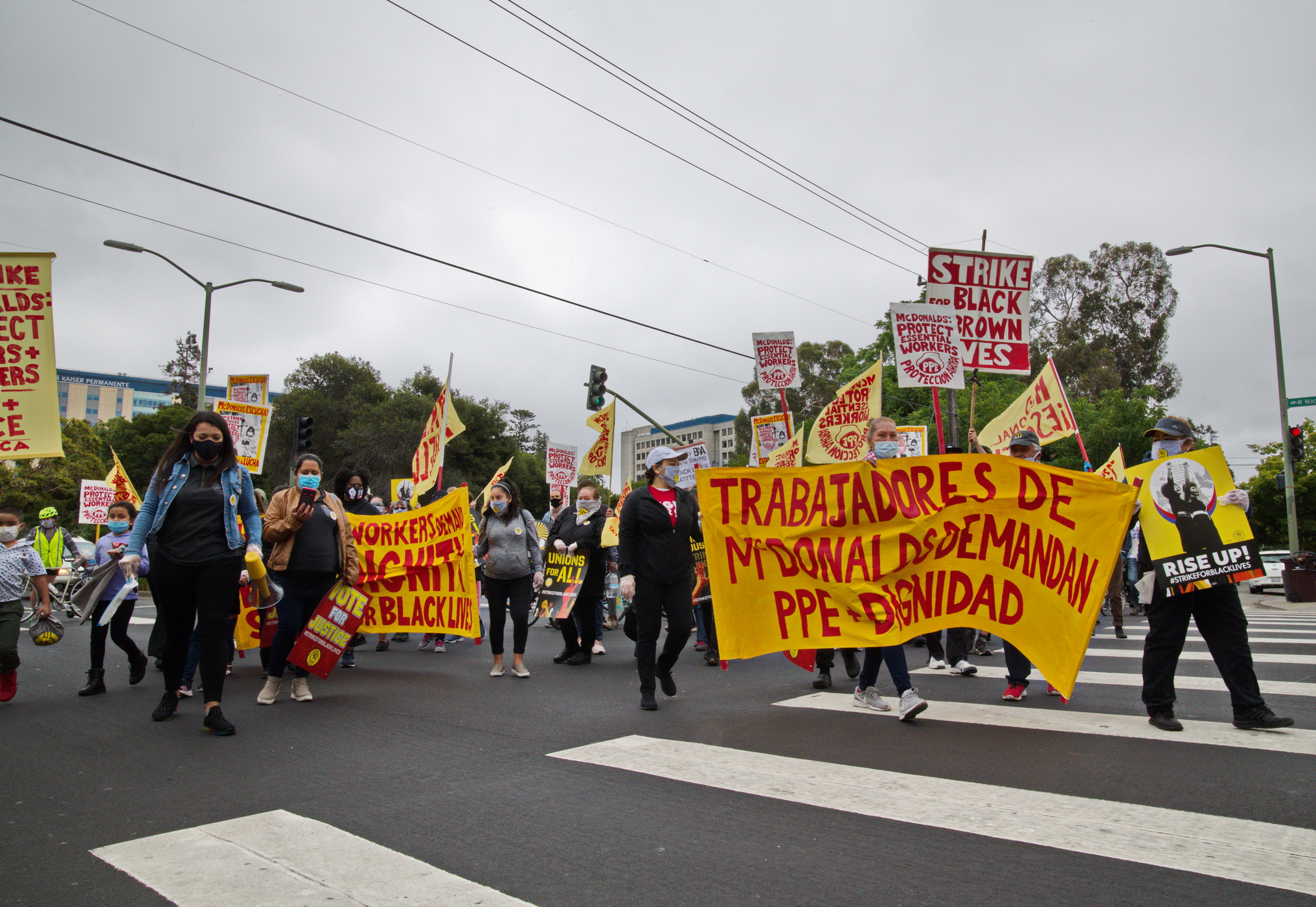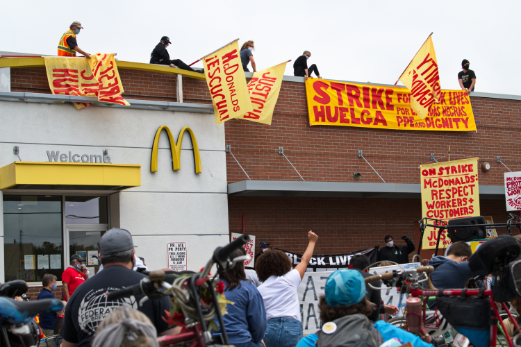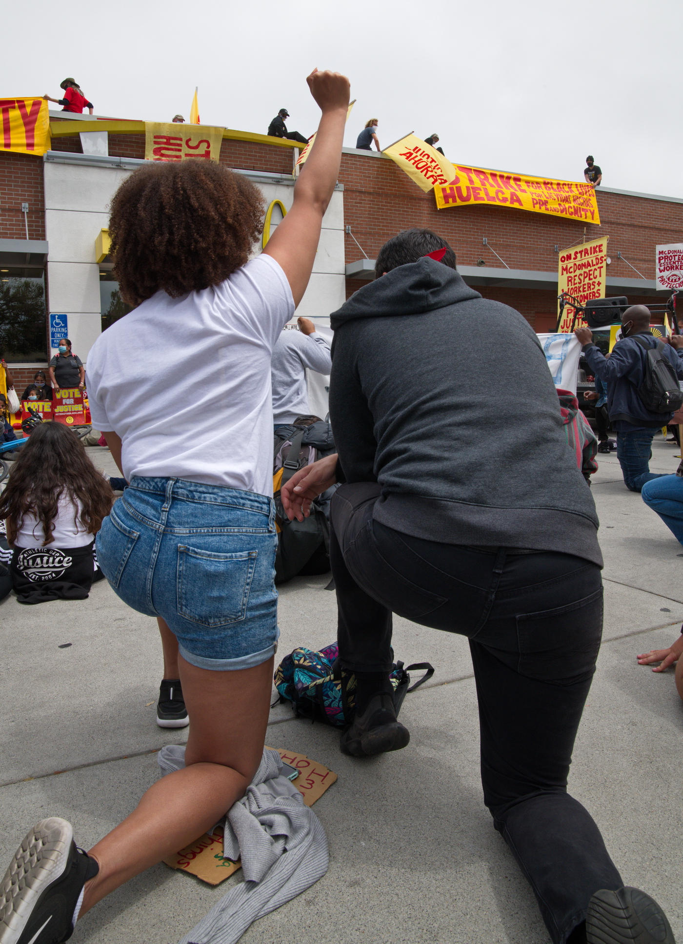 The combined rooftop and ground demonstration was emphasizing not only the Black Lives Matter movement but demands by McDonalds workers for respect, dignity and, specifically, for adequate on the job protective equipment. The action was part of an evolving national movement reaffirming rights and repect for working people and demanding that genuine racial equality be finally achieved.