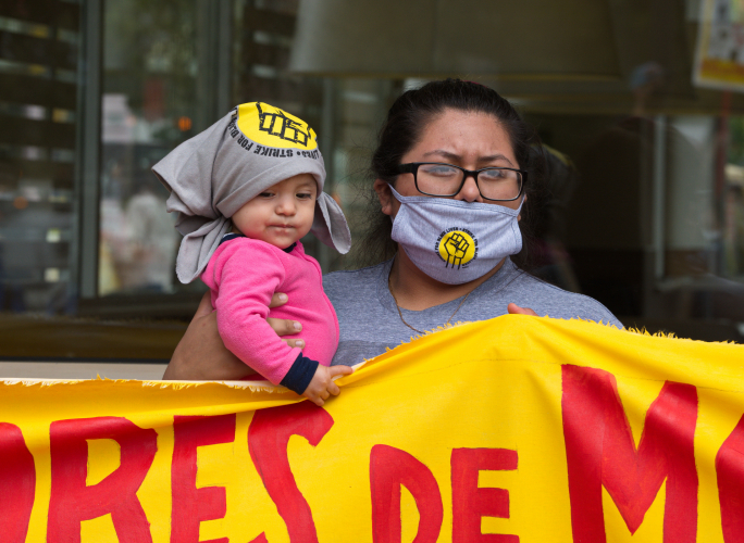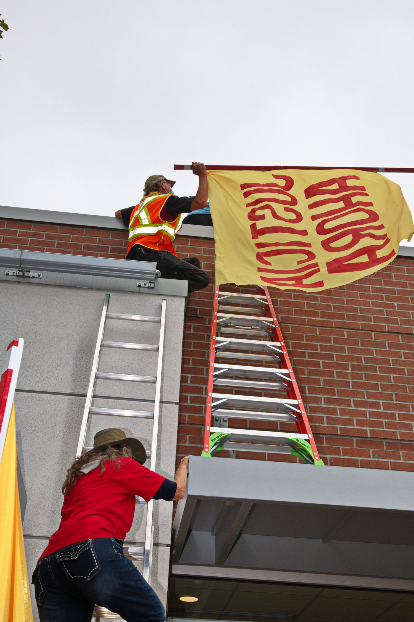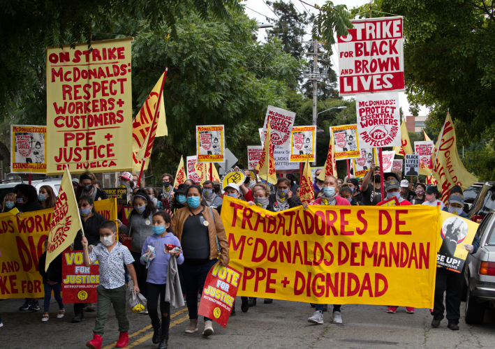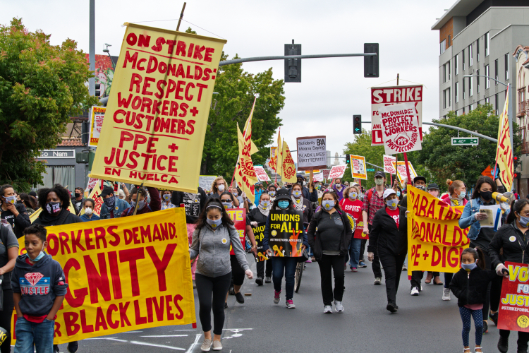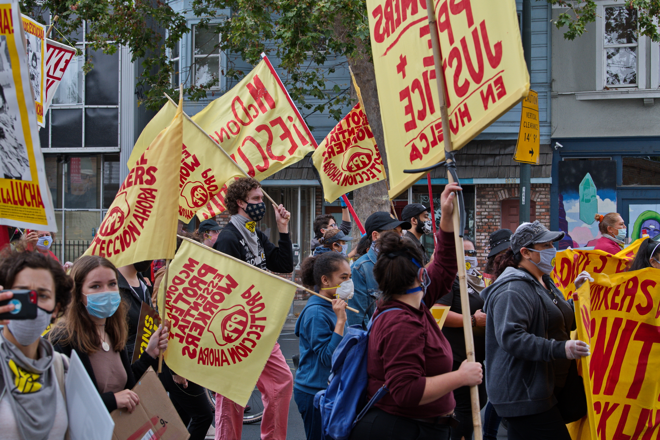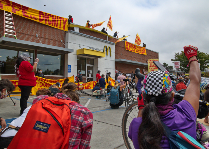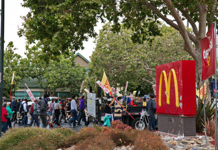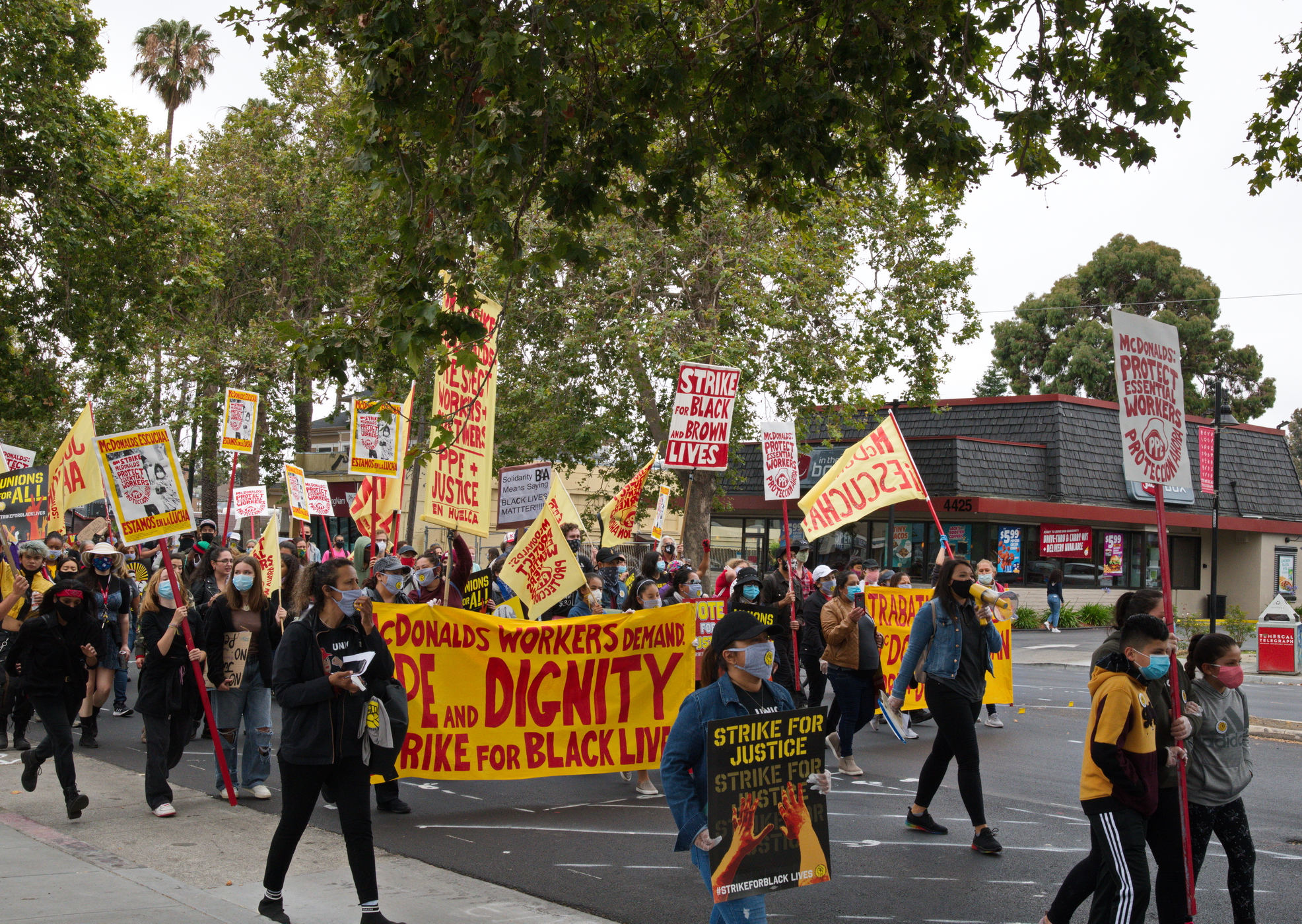 On Monday,July 20, as part of the national Strike for Black Lives, activist and demonstrators assembled at Oakland's Mosswood Park for their march. After several speeches they massed on Webster Street and marched to McDonalds on Telegraph Ave. The marchers were a diverse group of about three hundred Black, Latinx, White and children.At the McDonalds parking lot, while displaying many large banners, making speeches and giving press interviews, ladders were placed against the building and banners and signs were carried to the building's roof.