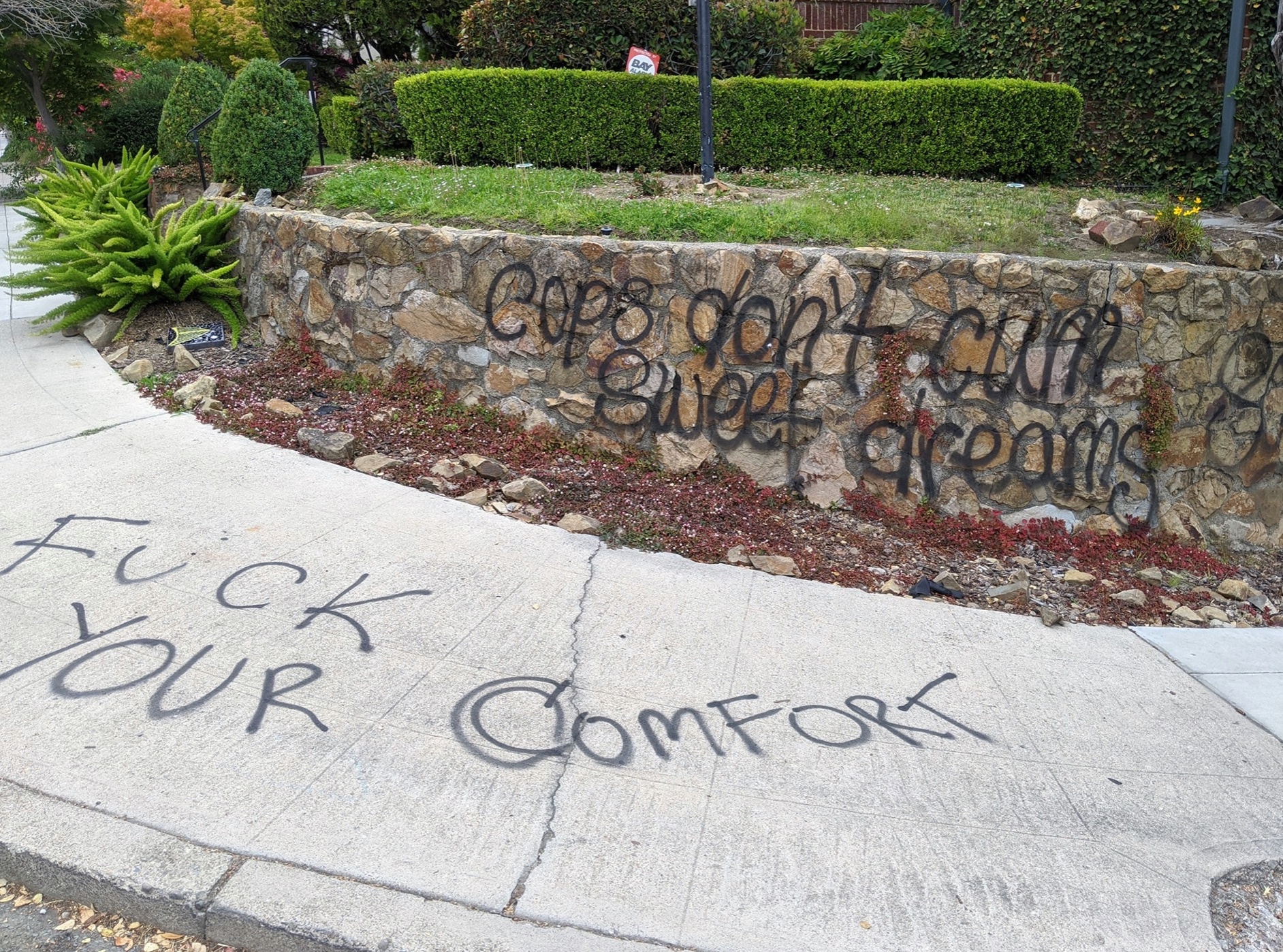 The "cops don't come, sweet dreams" and the overall cartoony look of the damage is a real tell that the OPD were behind this damage. Also the fact this was done the night before the vote to defund the police.