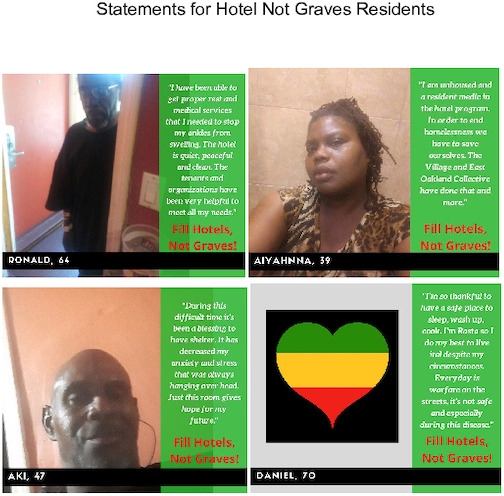 Fill Hotels not Graves is the innovative collaboration of The East Oakland Collective, Love and Justice in the Streets, and The Village in Oakland. Relying on a GoFundMe campaign, and without support from any government agencies or figures, they have sheltered vulnerable folks, prioritizing elders, the immunocompromised, and families with infants and small children. The goal is to give unhoused Oaklanders a site to Shelter In Place before they contract the deadly virus.