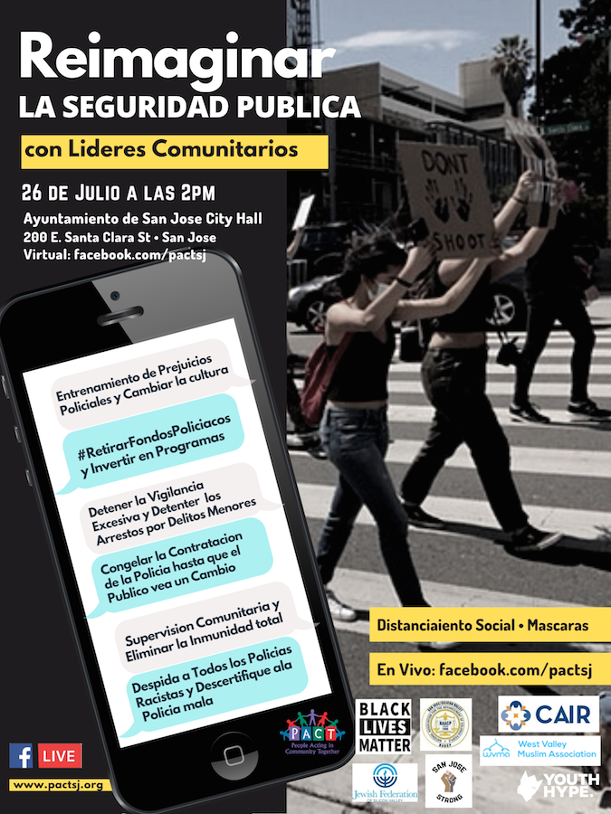 PACT, NAACP, CAIR, Black Lives Matters and other orgs are uniting to transform local justice at the "Re-imagine Public Safety" Rally in San Jose, Sunday 7/26 at 2pm.