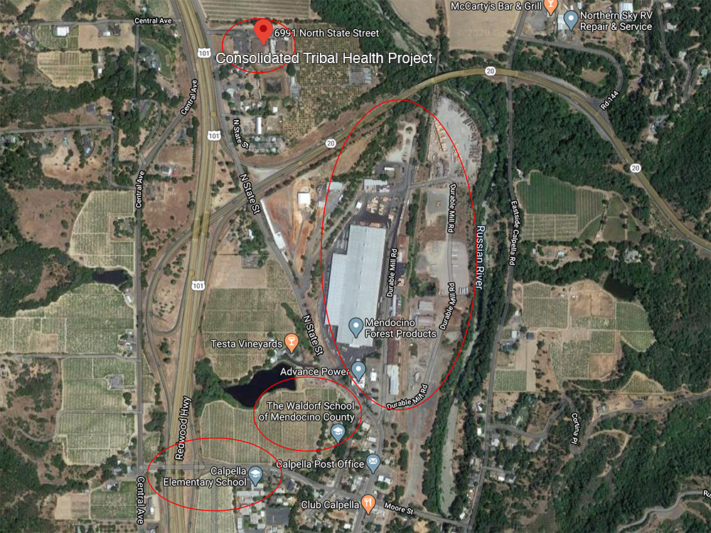 The Mendocino Wood Pellet Production Plant, operated by Mendocino Forest Products, is located one mile from the Reservation of the Coyote Valley Band of Pomo Indians and in the same valley as the Redwood Valley Band of Pomo Indians and is situated a block away from the Consolidated Tribal Health Project (CTHP) Clinic, a health clinic which serves 9 Tribes, and a few blocks away from a public and private school. Literally downstream from the plant is a working class neighborhood consisting mostly of Hispanic residents and families.