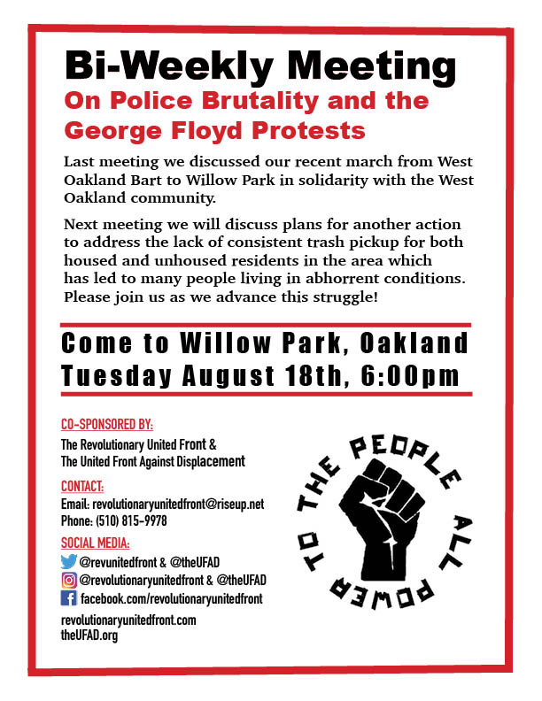 In the next meeting taking place on Tuesday, August 18th which we are promoting in this post, we will discuss plans for another action to address the lack of consistent trash pickup for both housed and unhoused residents in the area which forces people to live in abhorrent conditions. More broadly, we will continue to talk about how to link the local struggle in Oakland to the larger nation-wide movement against the white supremacist capitalist system.