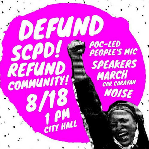 A coalition of SC organizations plans a MASSIVE POC-led demonstration at City Hall on Aug 18th when the Council will discuss the budget for police w/ a people's mic and calls for cutting/redirecting much of SCPD's funding.