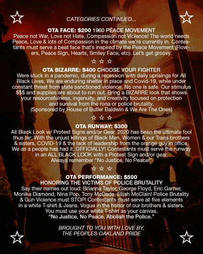 Were stuck in a pandemic, during a recession, and daily uprisings for All Black Lives. We are enduring shelter in place and Covid-19, while under constant threat from state sanctioned violence. No one is safe. Our stimulus $$$ and supplies are about to run out. Bring a BIZARRE look that shows your resourcefulness, ingenuity, and creativity focused on protection and survival from the rona or police brutality.
