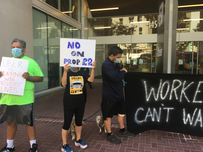 Uber and Lyft workers and supporters protested at the UBER World Headquarters to demand worker benefits and also to oppose Proposition 22 which would undermine AB5 which forces ridedshare companies to pay workers comp, disability and social security,