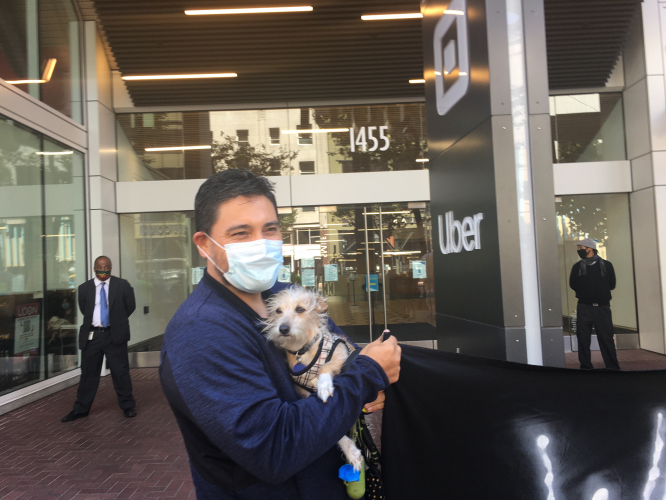 UBER workers and supporters of California AB5 rallied at the UBER world headquarters on 8/20/20 to demand social benefits for drivers of UBER, Lyft and other companies and also