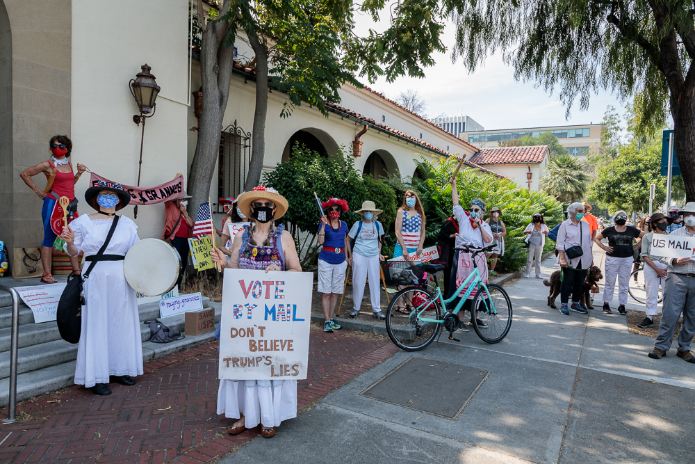 On August 22, decades long voting rights activist Gail Sredanovic said, "We must defend the essential services provided by the U.S. Postal Service, including our ability to vote by mail. Today we are pushing back against the Trump administration's attacks in front of Palo Alto's historic downtown post office."