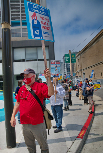 If a foreign power attacked the nation's postal system to subvert its ability to conduct a national election, it would be considered an act of war. Trump's removal of sorting machines and mail boxes in order to delegitimize an election he fears loosing, goes far beyond his usual "flouting of norms". It is an attack on the functioning of the Republic.Postal workers understand this. Through their APWU and NACL unions, they have organized nationwide rallies in protest. On Tues Aug. 25, San Francisco's postal workers rallied at noon next to the Market Street, Fox Plaza post office.