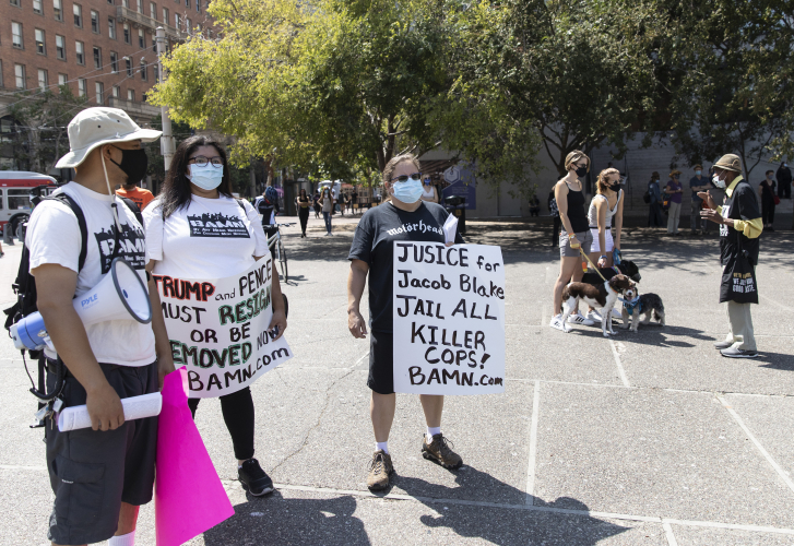 While the overarching theme was the removal of Trump and Pence, signs and speakers addressed the many problems that America faces. The summer of 2020 has been hot, and one topless protester stayed cool sans shirt waving their "We Can't Breathe" Banner. Another demonstrator displayed a "Protect Trans Lives" sign subtitled "We're Queer and We're Angry." Speakers gave voice to the suffering of immigrants whose families and communities have been terrorized. The environmental movement and womyn's rights were also addressed.