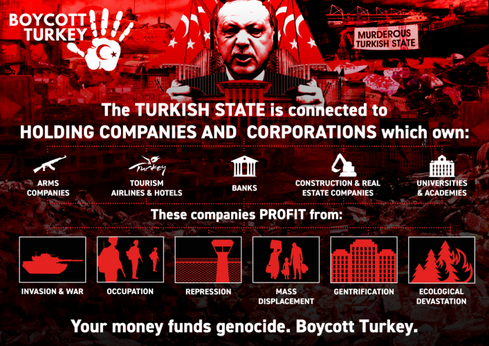 These citizen initiatives include boycotting Turkish construction companies; restaurants, nightclubs; grocery stores and packaged goods; Turkish rugs, carpets, and textiles; Turkish music/ dance performances, and musical recordings; Turkish movies and soap operas; Turkish Airlines and tourism to Turkey, Azerbaijan, and/or N. Cyprus; as well as discouraging enrollment in Turkish language and studies programs at international academic institutions, many which are deeply enmeshed with the Turkish government and its military industrial complex.