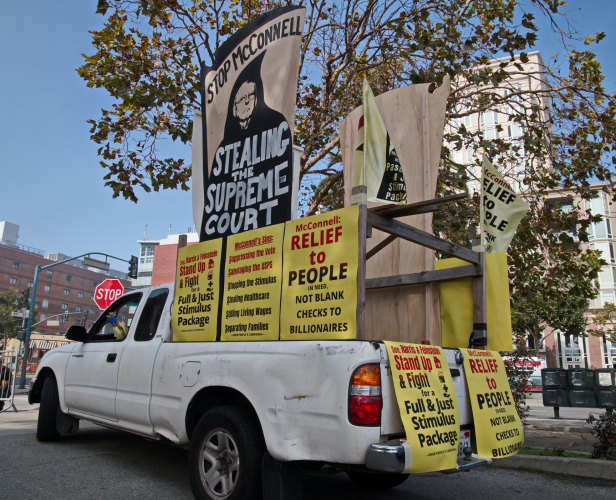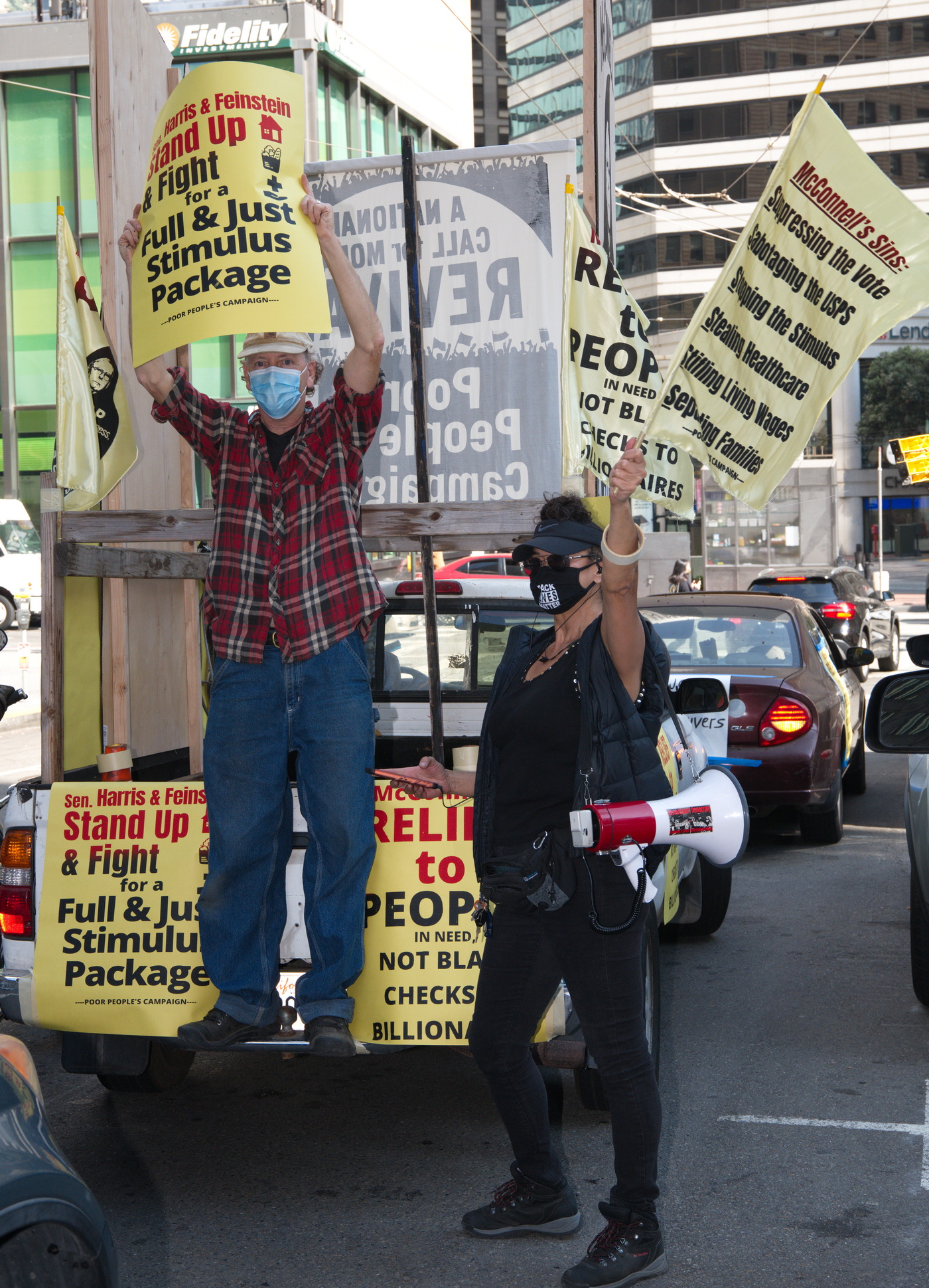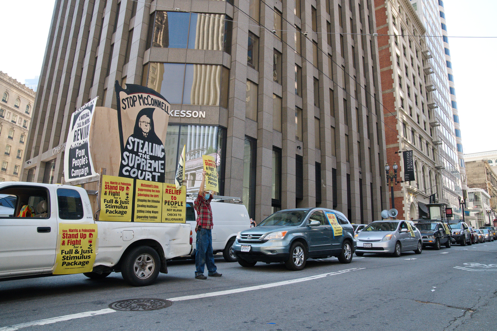 On Monday, October 5, a Poor People's Campaign car caravan demonstrated in front of Senators Feinstein's and Harris' San Francisco offices. Led by a truck with a large sign demanding that McConnell not steal the Supreme Court, about thirty cars, a motorcycle and a bicycle assembled in the ILWU parking lot on second street and made their way to the Senators' downtown offices. As noted in their event notice, it was a protest against:the meanness, misery, and mayhem of Senate Majority Leader Mitch McConnell and his Senate enablers.