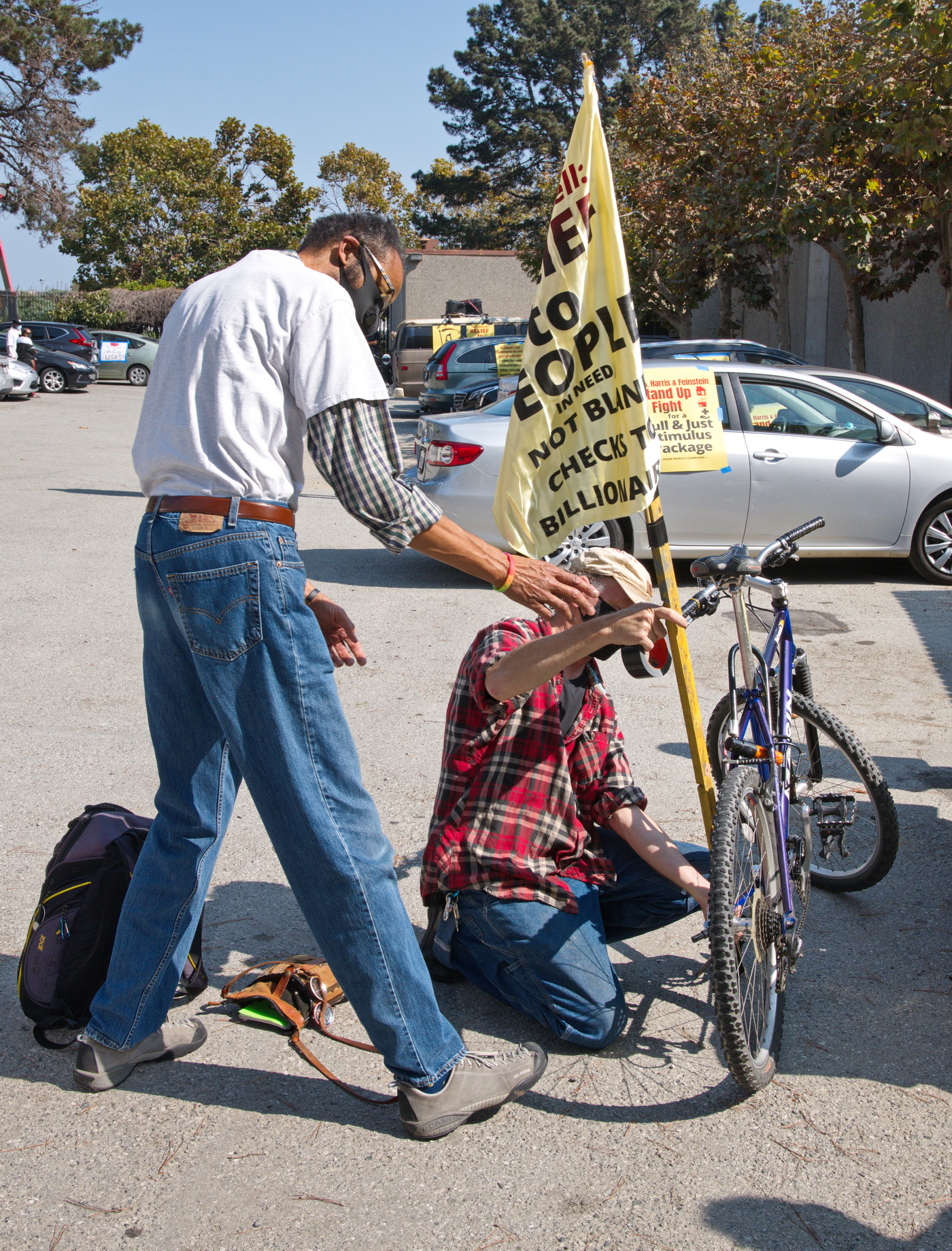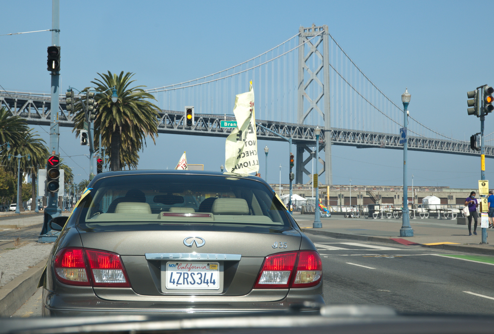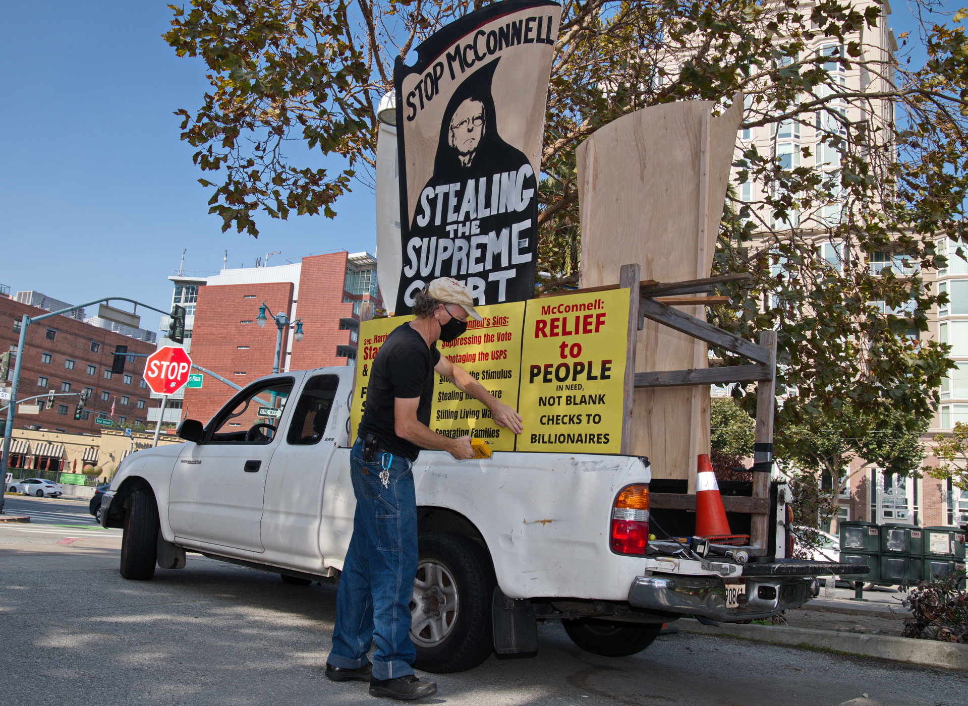 On Monday, October 5, a Poor People's Campaign car caravan demonstrated in front of Senators Feinstein's and Harris' San Francisco offices. Led by a truck with a large sign demanding that McConnell not steal the Supreme Court, about thirty cars, a motorcycle and a bicycle assembled in the ILWU parking lot on second street and made their way to the Senators' downtown offices. As noted in their event notice, it was a protest against:the meanness, misery, and mayhem of Senate Majority Leader Mitch McConnell and his Senate enablers.