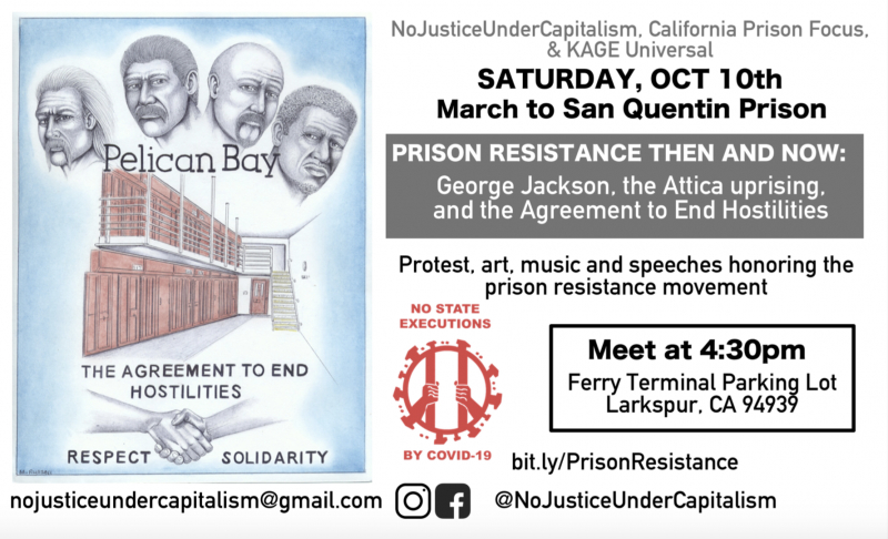 On October 10th, No Justice Under Capitalism along with California Prison Focus and KAGE Universal (Kings and Queens Against Genocidal Environments) will be holding a demonstration at San Quentin State Prison to recognize and celebrate the anniversary of the Agreement to End Hostilities. Through a range of politically engaged speakers and performances by formerly incarcerated artists, we will be honoring the history of prison resistance from George Jackson to the Attica Rebellion, from the Pelican Bay Hunger Strikes to the Agreement to End Hostilities, a historical document which called and continues to call for an end to all racial hostilities both behind enemy lines and beyond in order to promote the unification required to dismantle the conquer and divide strategies of the carceral state system. The demonstration will conclude with a vigil honoring the lives lost in the struggle for liberation from the carceral state and the 69 lives lost (as of Oct 6) to Covid-19 due to state negligence. We welcome all participants to bring photos, flowers, and candles for a temporary altar at the West Gate. Please find more information here and in the attached flyer.