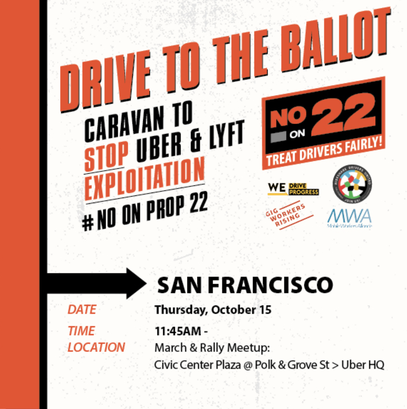Join them outside the Uber HQ at noon on Thursday to demonstrate your support for a #NoOnProp22.