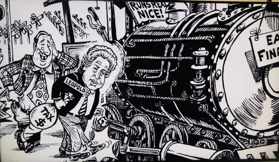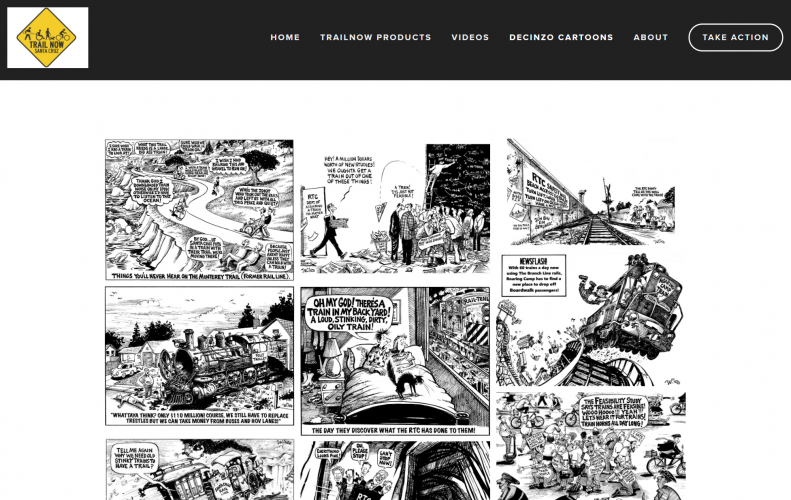 The cartoons all focus on one subject: the rail-trail. They were illustrated by cartoonist Steven DeCinzo and commissioned by Trail Now to oppose use of the rail system and the re-establishment of train service along the coastal trail in Santa Cruz County. It is not clear how many of the cartoons were used directly by Koenig's campaign. At least one of Koenig's television ads prominently features a DeCinzo rail-trail cartoon with Leopold in it (see video below).