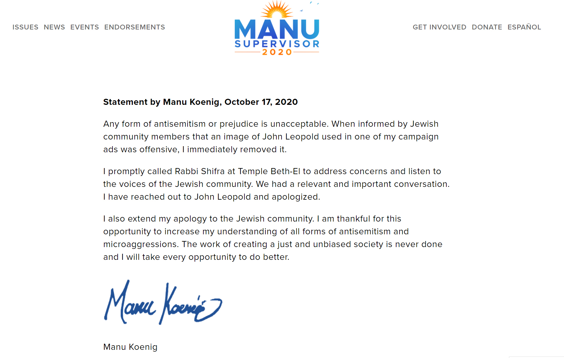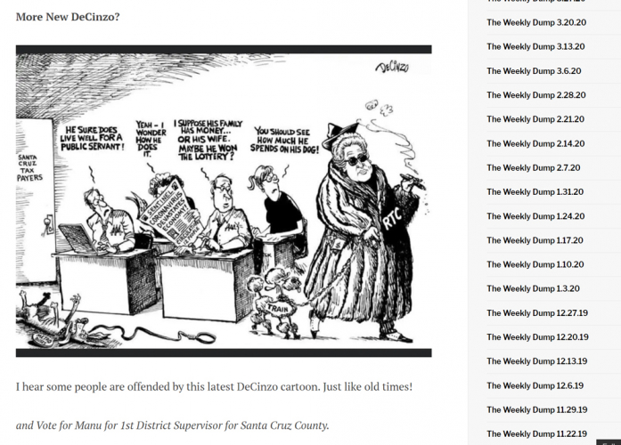 Although Koenig has said he is not directly involved with Trail Now, the lines between that group and Santa Cruz County Greenway, as well as Koenig's campaign, become blurred at times. Apparently, Koenig and Peoples met together with Rabbi Shifra Weiss-Penzias of Temple Beth El in Aptos to discuss the anti-Semitic cartoons. Brian Peoples met with the Rabbi, according to Jack Brown, who is a longtime opponent of the rail system and advocate of electric automobiles. "Brian manned up and openly apologized for the cartoon after speaking to Rabbi Shifra Weiss-Penzias," Brown said about Peoples on social media. In a separate post, Peoples said he was accompanied by Koenig at the meeting. "Manu did the right thing and talk[ed] to [the] Rabbi," Peoples said.