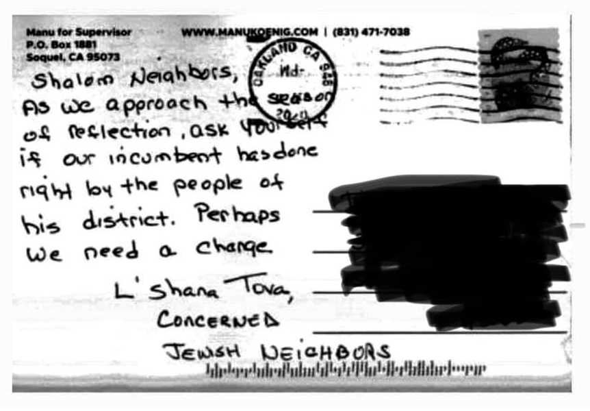 That campaign postcard you reference, I was among the Manu supporters who responded to the Manu campaign, to the invitation, if we were up for it, to take a bunch of postcards and handwrite to our Community why we support Manu for Supervisor. That particular postcard-writer, bless her heart, is a Jewish person who wrote her postcards to her Jewish Community, in all innocence. And now she has been totally roundly publicly-shamed for that. This comes across as a tactic to frighten people off from even stepping in. She has apologized. She has said she didn't realize it would be offensive. She has even apologized to the Manu campaign for causing them so much aggro. What is a person to do? We are sincerely seeking a robust democratic process, real conversations. How else are we ever going to embody "a government of the People by the people for the people". This shit is just so heartbreaking.