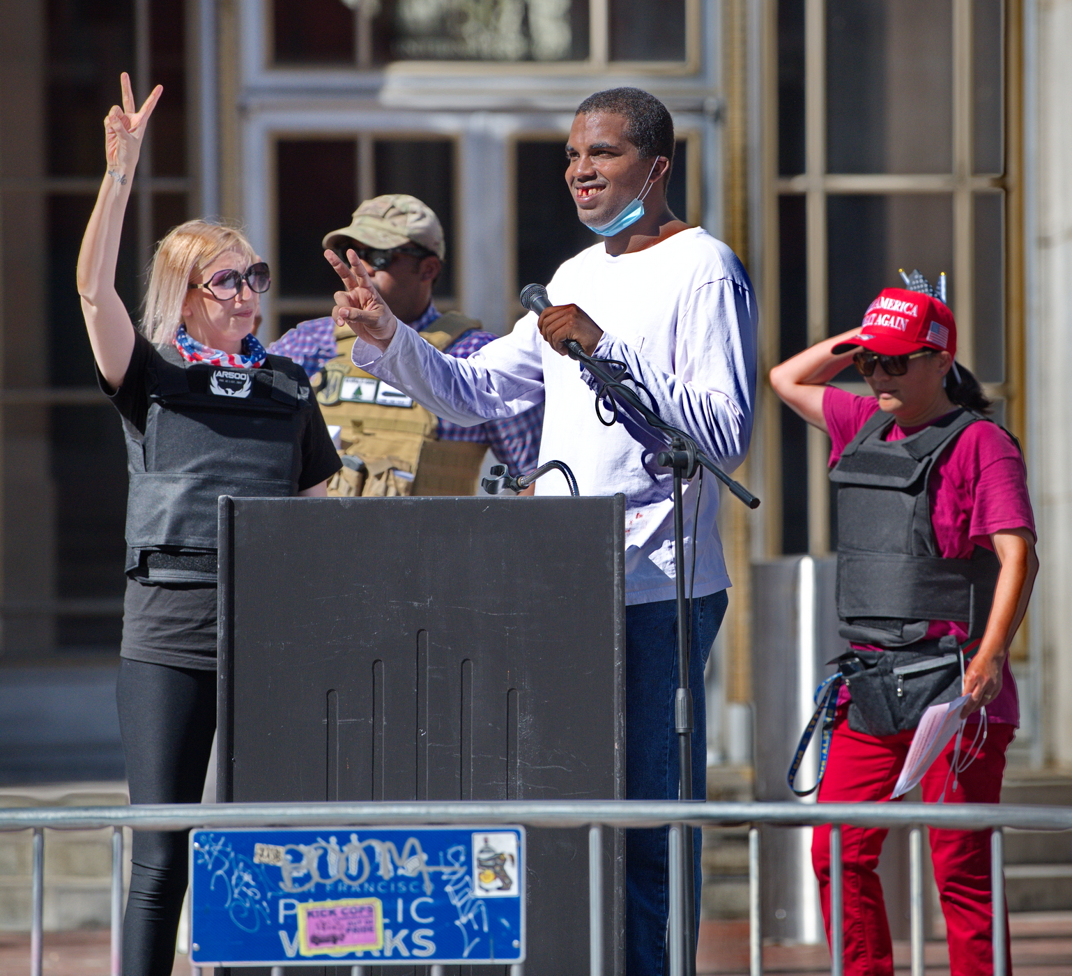 Maskless Trump supporters in bulletproof vests attempted a rally near City Hall. Police attempted to keep furious San Franciscans behind metal barriers. However, the protesters kept police on the run as they redeployed at various locations around City Hall. At one point the police used pepper spray.
