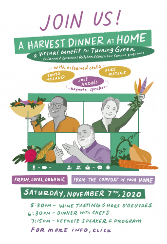 Turning Green is proud to announce its first ever Virtual Harvest Benefit taking place online Saturday, November 7. Friends, patrons and community members of Turning Green will join the Virtual Harvest Benefit across the Bay Area to celebrate an inspirational evening of storytelling, conversations and a delicious fresh, local, organic dinner. Each year, the Virtual Harvest Benefit raises funds for Turning Green’s flagship programs, Conscious Kitchen and Conscious Campus, that inform, inspire and mobilize the next generation of ecoleaders. Attendees, tasked with simply heating and plating the meal, will join the Zoom dinner table with participating chefs, Alice Waters, Tanya Holland, Ashley Ugarte, Guillaume Pfahland and Dolores Coleman, to talk about the meal preparation, ingredients and share rich stories and meaningful anecdotes; followed by a Keynote by chef and humanitarian, José Andrés.