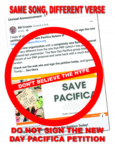 Disclaimer: “This communication has not been paid for by the KPFK, KPFA, KPFT, WBAI, WPFW LSB or the Pacifica Foundation. It is a campaign communication distributed by or on behalf of NEW DAY PACIFICA. Otherwise, it has no affiliation with or endorsement by any LSB or the Pacifica Foundation. Please note that you are receiving this email because you are on the membership list of KPFK, KPFA, KPFT, WBAI, or WPFW.”