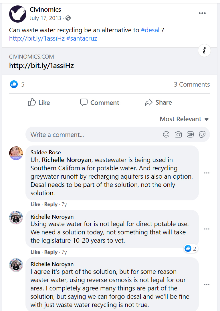 "Manu Koenig claims transparency; however, when carefully reviewing his experience and record, there is a significant omission. He developed a controversial research project for the City of Santa Cruz by Civinomics, a polling and political strategy company co-founded by Koenig and Robert Singleton. In 2011, Civinomics was retained by the city to conduct outreach and marketing related to the proposed construction of a regional desalination plant. At the same time, opponents of the plant mounted a grassroots petition campaign to guarantee the right to vote on desalination. Despite City Council opposition to the campaign, voters overwhelmingly passed Ballot Measure P in 2012. Subsequently, the city decided to shelve desalination. Primetime TV ads, pricey signs and mailers, deceptive social media marketing, and anti-Semitic cartoons — don’t be bamboozled by Koenig and his supporters."