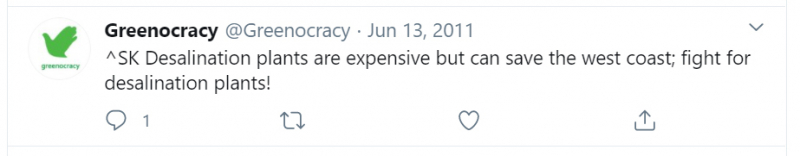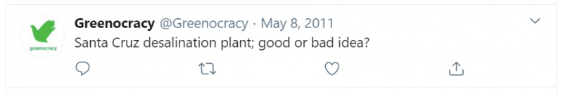 Greenocracy first advocated on social media for desalination in May of 2011, and Singleton wrote a pro-desalination blog post in December of 2011 (see photos). In September of 2011, Greenocracy was retained by the City of Santa Cruz's "scwd2" Desalination Program to educate the public on the proposed desalination plant. Greenocracy developed an iPad interview tool to conduct the marketing and community outreach campaign. The iPad wasn't just used to poll community members, it also displayed programming to convince individuals a desalination plant was needed.