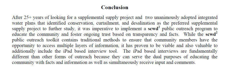 After the results of the campaign were compiled and submitted to the City, the Desalination Task Force wrote on March 21, 2012 that, "the iPad interview tool has proven to be an effective method of gathering information because it serves the dual purpose of educating and interviewing people at the same time."