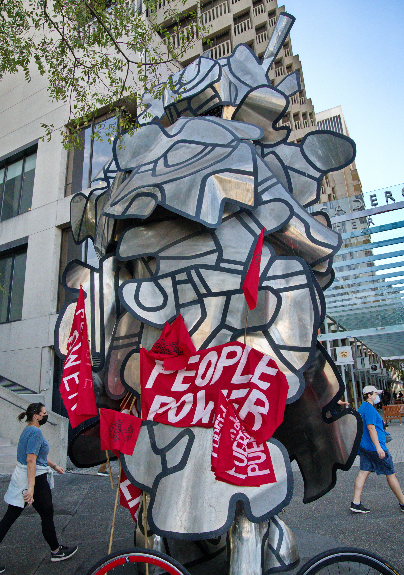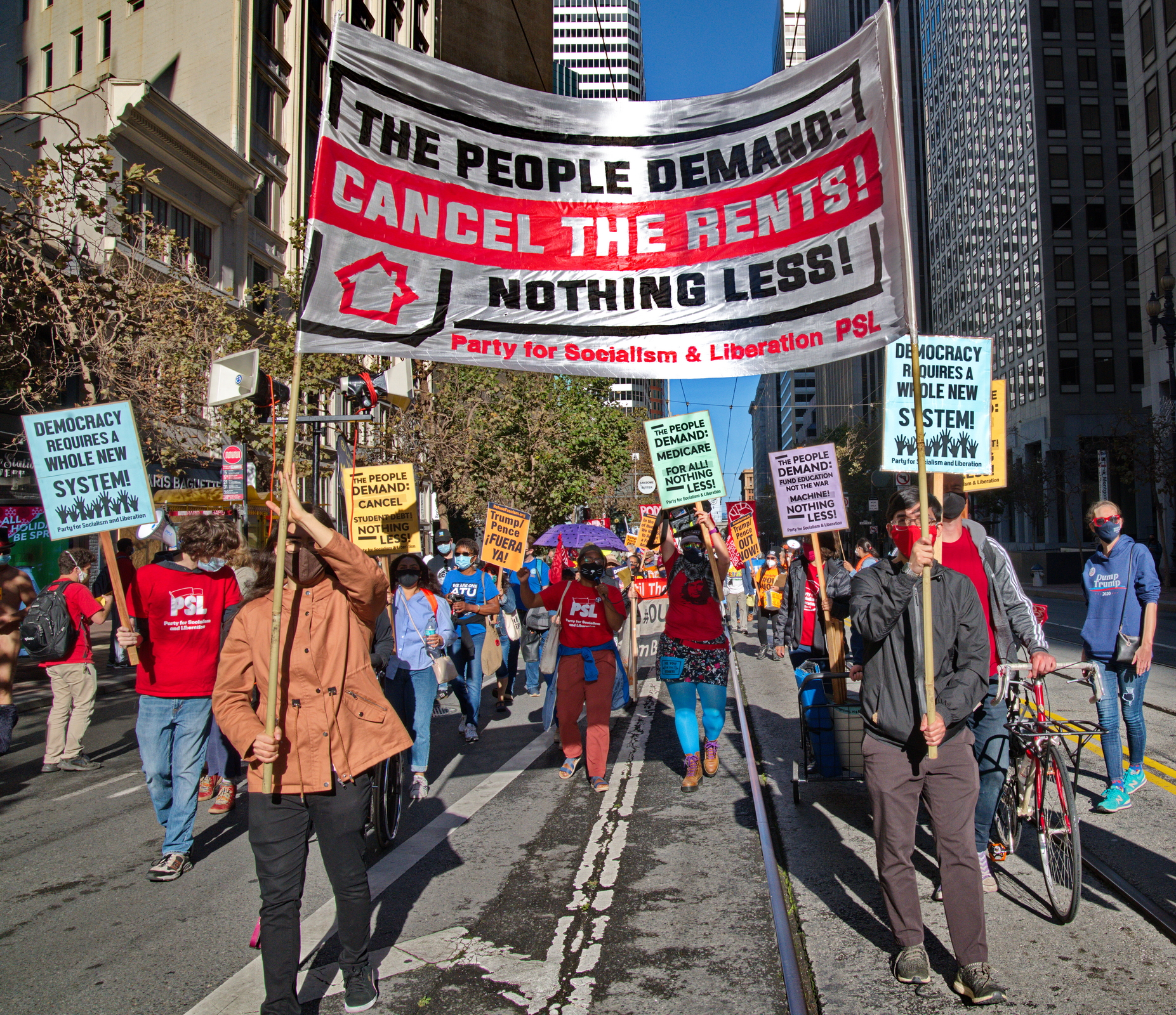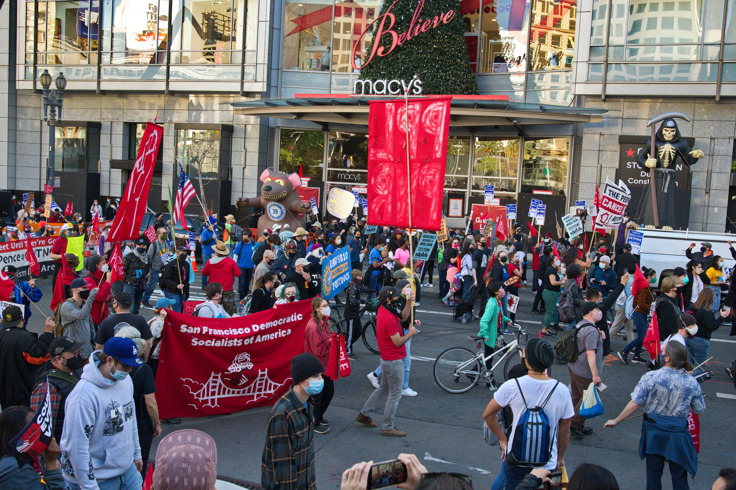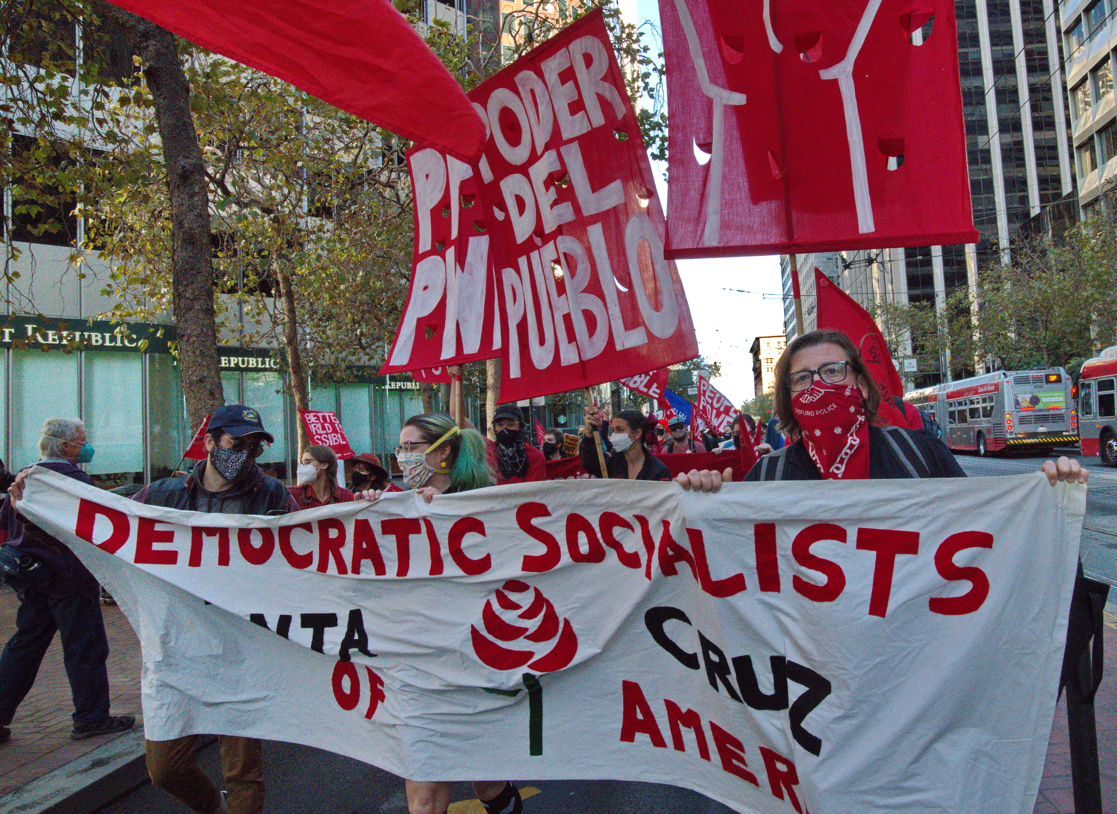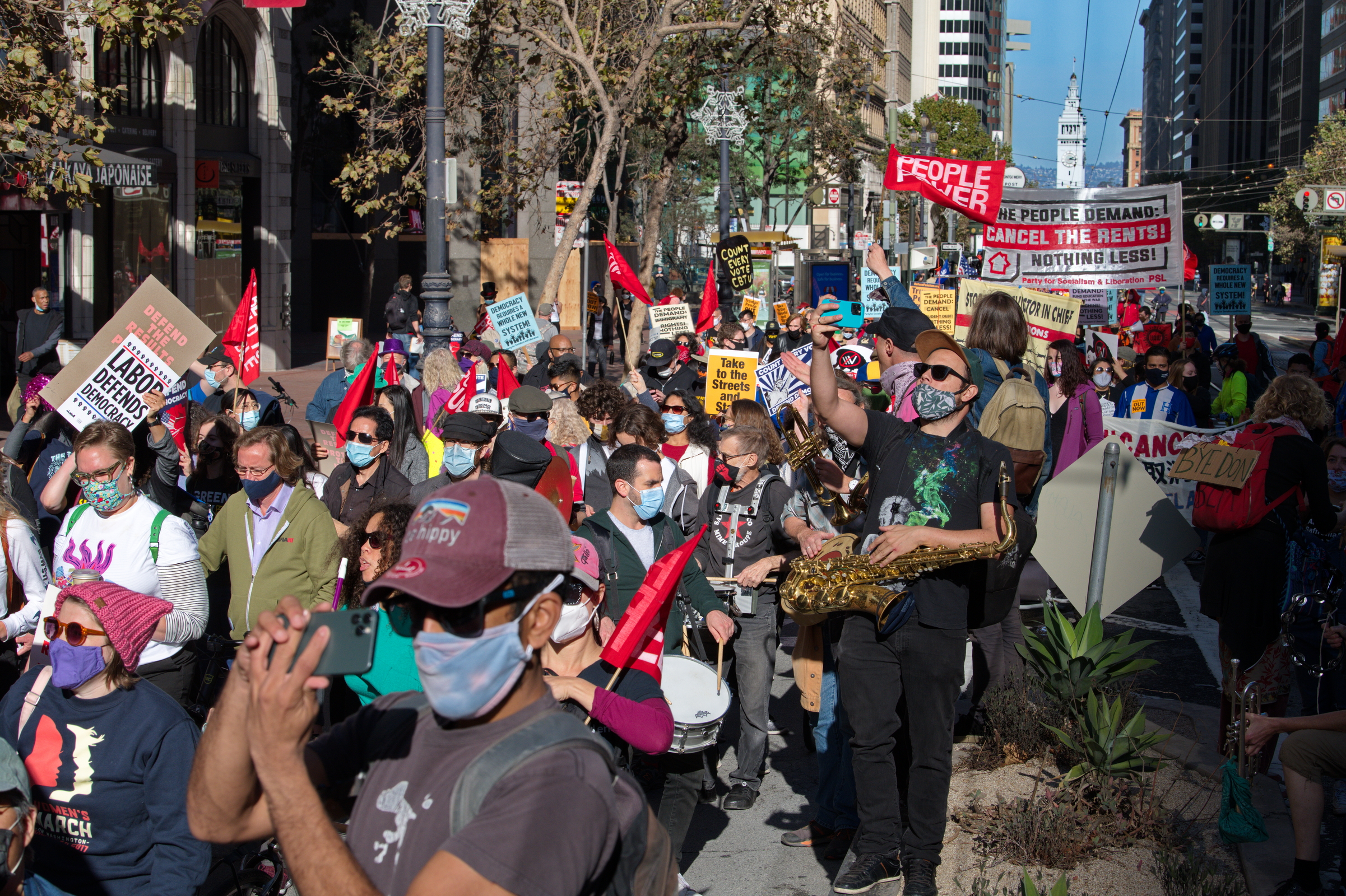 As news of networks' calling Biden's victory went out, rallies and marches demanding a complete count of the votes still went forward. In San Francisco's Justin Herman Plaza, over 2000 people rallied with speeches and music. They followed up with a march to Union Square.Many groups participated. Strange for a supposedly modern democracy, activists demanded a complete tally of the votes. Trump's defeat was gratefully celebrated. There were BLM protesters and Refuse Fascism was there in force. Large, bright red flags and banners announced several Socialist groups.