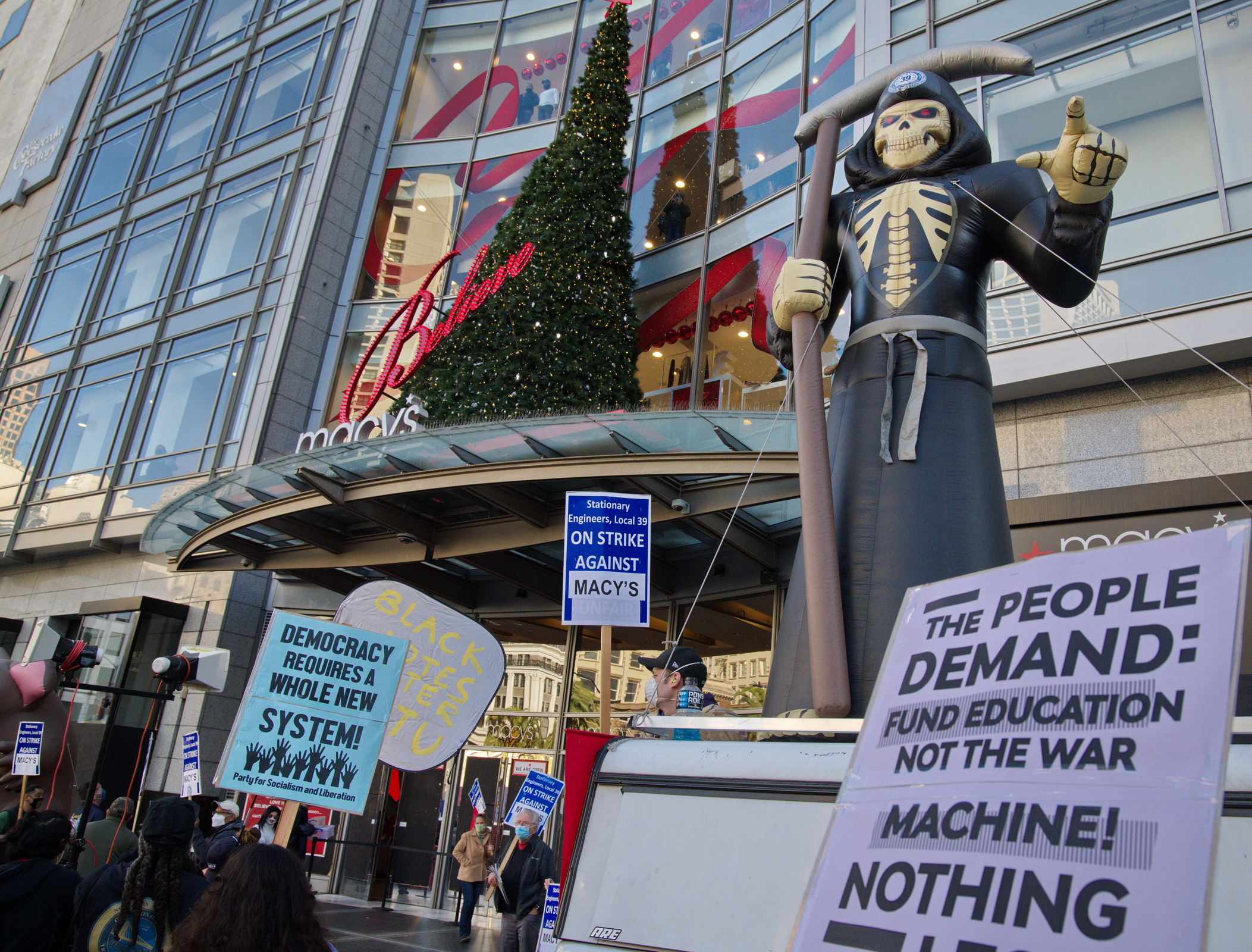 Well organized labor contingents provided a large sound truck and led the march to Macy's front door on Union Square where a powerful demonstration was held.