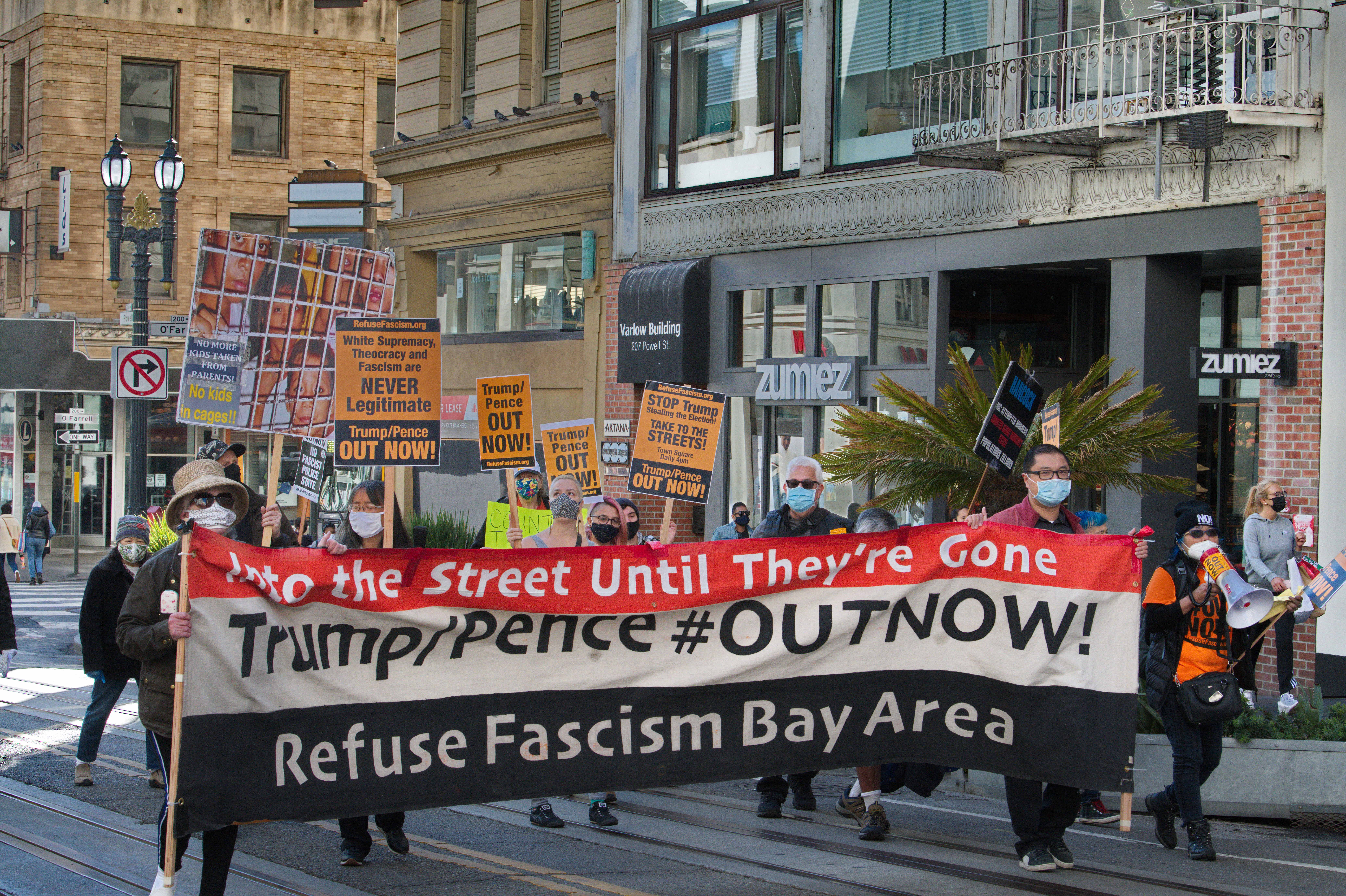 A protest labeled "Biden's Win Is a Very Good Thing, But the Struggle Is Far From Over " rallied at Powell & Market, San Francisco and marched to Union Square. It was organized by San Francisco's ever active and increasingly mainstream Refuse Fascism Bay Area. They rallied on Market & Powell Streets, danced to some lively music and then marched up Powell Street to join the "Close the Camps" demonstration in progress in Union Square.