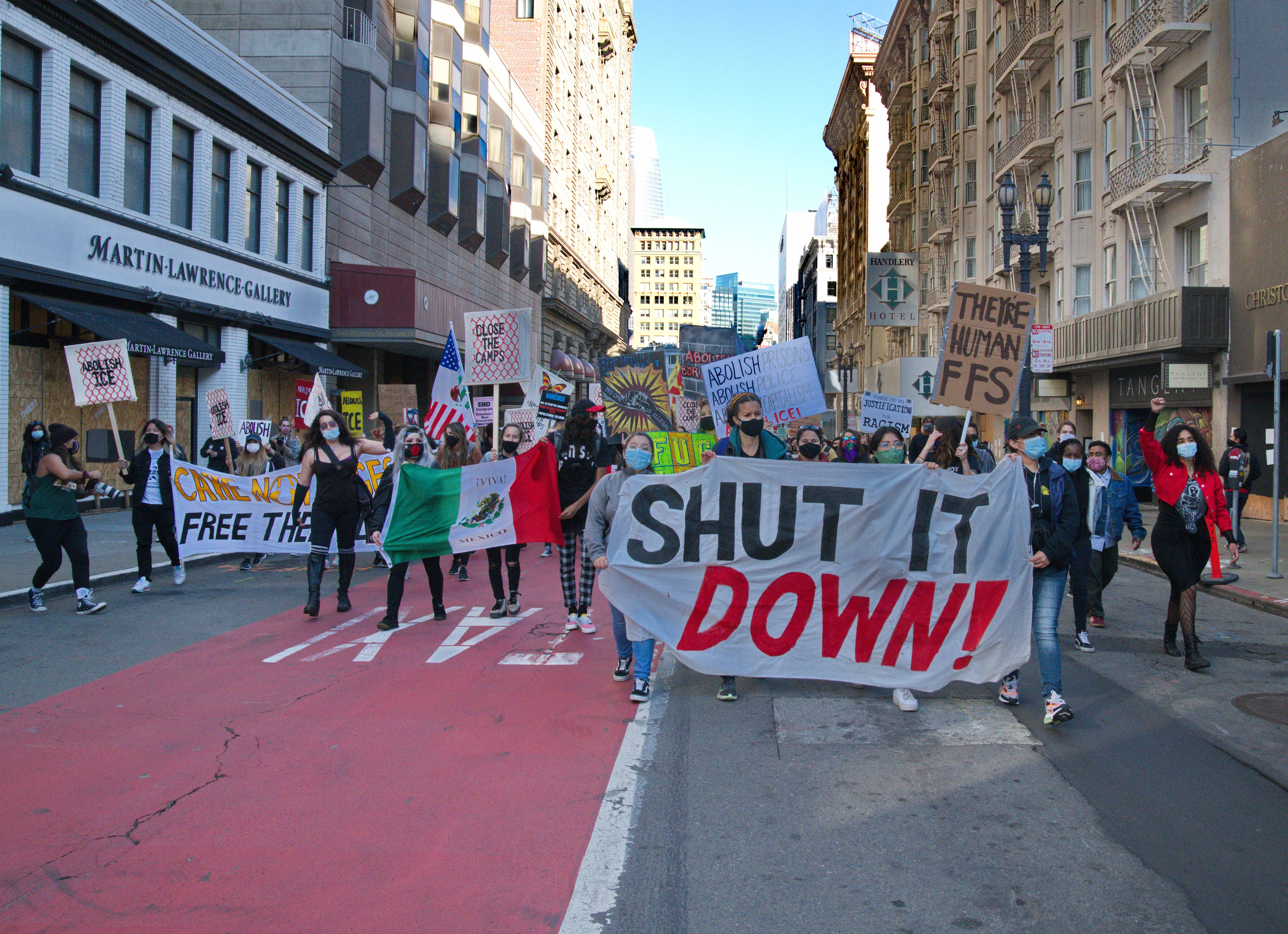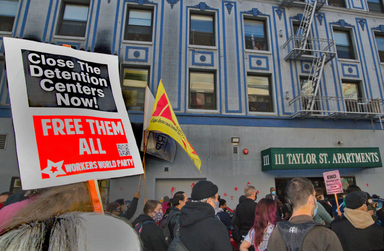 111 Taylor Street looks like an ordinary apartment building but is, in fact, a privately managed prison run by GEO Group. The march halted in front of the building where many called out the outrage.