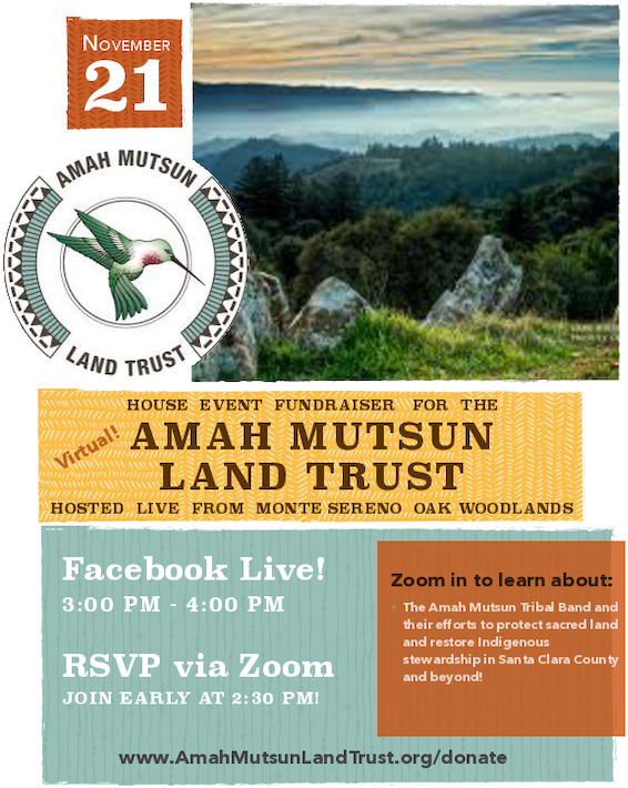 Please join us live from the Monte Sereno oak woodlands on Saturday, November 21st, for a virtual house event to raise awareness and funds for the Amah Mutsun Land Trust. Featuring Chairman Valentin Lopez, of the Amah Mutsun Tribal Band.