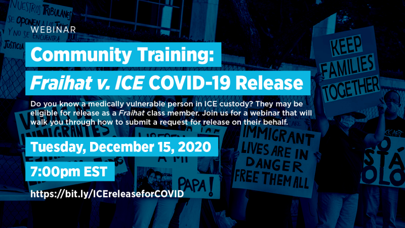 Si tiene familiares o miembros de la comunidad bajo la custodia de ICE, ¡no querrá perderse este importante seminario web! Únase a nosotros y conozca la orden reciente en Fraihat v ICE y cómo podría aplicarse a su amigo / familiar detenido bajo la custodia de ICE. También compartiremos recursos útiles que los abogados y los miembros de la comunidad pueden utilizar para realizar solicitudes de redeterminaciones de custodia en nombre de las personas detenidas.