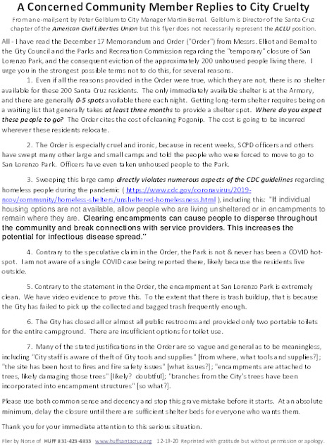 I'm reprinting Gelblum's because (a) I regard it as articulate, concise, and frighteningly relevant; and (b) it is a public document since it was sent to a Martin Bernal, the Santa Cruz City Managler (or City Manager, as he styles himself). Over the years I've had (and probably will continue to have) real problems with the ACLU's positions regarding civil rights for homeless folks here in Santa Cruz. But Gelblum's public positions on local issues have gotten stronger over the past few years.