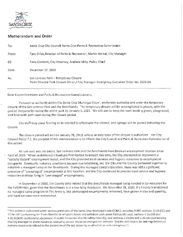Background: On December 17th, 2020 the city manager of Santa Cruz – Martin Bernal - issued emergency executive order number 2020 – 24 ordering the temporary closure of downtown San Lorenzo Park. The city-run homeless campground that was established in the benchlands area of the park was moved recently to De Laveaga Park, though 200 or more people remained in other areas of San Lorenzo Park, many in tents near the duck pond and lawn bowling greens.
