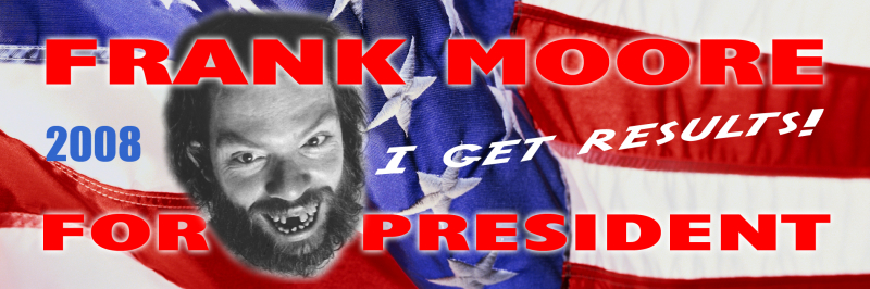 Frank Moore (1946–2013) was an artist, poet, painter, shaman, and teacher based in Berkeley, California. In 2008, and alongside running mate Susan Block, a sex educator and author, he mounted a campaign for president of the United States of America. A political novice who used a wheelchair and communicated primarily through a head-pointer, Moore intrinsically challenged norms of appearance, ability, and communication simply by way of showing up.