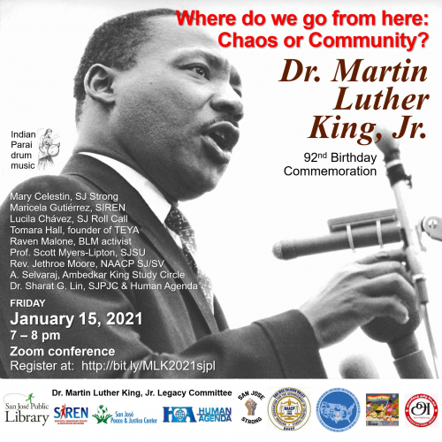 Co-sponsored by the Dr. Martin Luther King Legacy Committee, San José Public Library, NAACP of San José / Silicon Valley, Ambedkar King Study Circle, San José Strong, San José Roll Call, SIREN, Human Agenda, San José Peace and Justice Center, and American Tamil Media