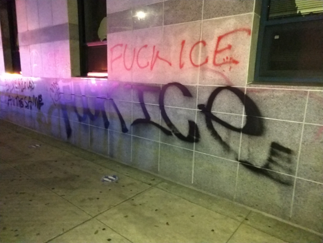 On January 18, as strong winds raged, 30+ anti-racists attacked the Immigration and Customs Enforcement office in San Francisco. We thoroughly painted the walls, smashed the windows, and breached the building to wreak havoc inside. We did this to initiate what will hopefully be the first in a series of breaks into and out of prisons and detention centers throughout the country. Like the tremors presaging last summer's uprising, we are responding to a generalized call to liberate all those locked within the modern plantation system.
