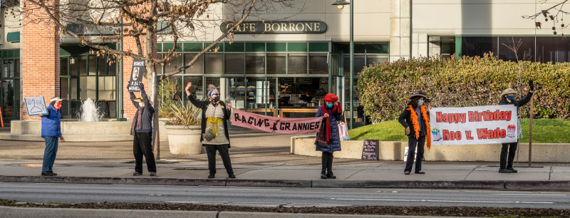 Photo: On the 48th anniversary of Roe v. Wade, members of the Raging Grannies mark the day in Menlo Park, California. Photo by Jim Colton, Pro Bono Photo. Please credit the photographer.