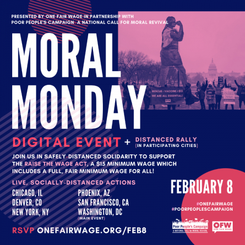 Join the Poor People's Campaign and One Fair Wage on Monday, February 8 for safely-distanced Fair Wage Rallies in Washington D.C. and other U.S. cities, as well as a Digital Rally livestream, to support the Raise the Wage Act for a $15 minimum wage, a full, fair minimum wage for all!
